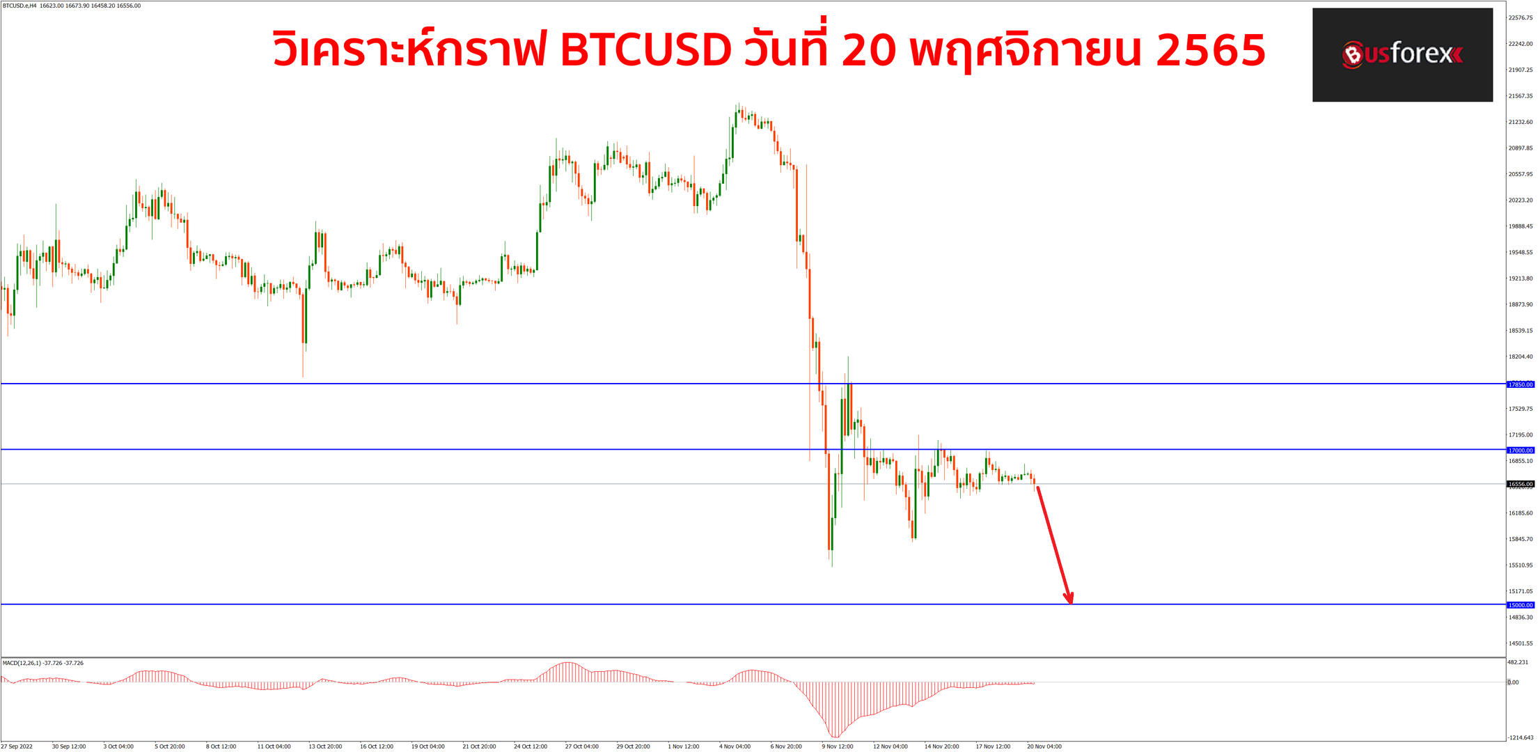 กราฟ BTC ยังคงเป็นขาลงเต็มตัว กราฟดีดตัวขึ้นไปทดสอบแนวต้านที่ราคา 17,000$ อยู่หลายรอบแต่ก็ยังผ่านขึ้นไปไม่ได้นะครับ แนวต้านนี้ก็ถือได้ว่าเป็นแนวต้านที่มีนัยสำคัญอยู่พอสมควร หากกราฟเบรกขึ้นไปยืนเหนือแนวต้านนี้ได้เมื่อไหร่ กราฟมีโอกาสที่จะพักตัวขึ้นไปรอบใหญ่อีกรอบได้ทันที สำหรับตอนนี้ที่กราฟยังเบรกขึ้นไปยืนเหนือ 17,000$ ไม่ได้ ก็จะมาหาจังหวะเปิด sell กันต่อไปก่อนนะครับ ในส่วนของแนวรับและแนวต้านวันนี้ยังคงมีแนวรับอยู่ที่ราคา 16,000$ และ 15,000$ ตามลำดับ ส่วนแนวต้านก็ยังเป็นแนวต้านเดิมที่ราคา 17,000$ , 17,850$ และ 18,000$ เช่นกันครับ