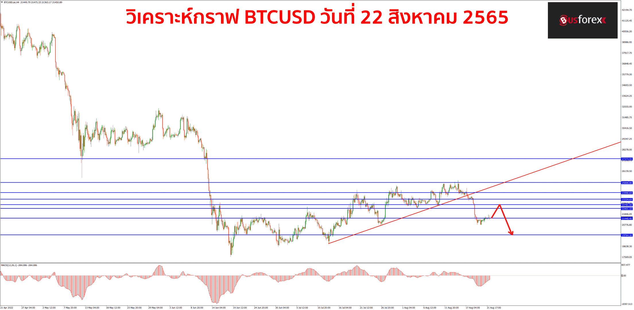 แนวโน้มกราฟ BTC ตอนนี้ได้กลับมาเป็นขาลงอีกรอบ หลังจากที่กราฟขึ้นไปทดสอบแนวต้านที่ 25000$ แล้วผ่านขึ้นไปไม่ได้ กราฟก็ปรับกลับลงมาอย่างต่อเนื่องจนสามารถลงมาเบรก low ของรอบสวิงใหญ่ก่อนหน้าได้ และตอนนี้กราฟ BTC กำลังทดสอบอยู่ที่แนวต้านแรกที่ราคา 21440$ อยู่พอดีนะครับ หากกราฟสามารถปิแท่งเทียนกลับตัวลงหรือทำแพทเทิร์นกลับตัวลงจากแนวต้านแรกนี้ได้ คาดว่าน่าจะได้เห็นกราฟลงมาทำ new low มาทดสอบแนวรับที่ราคา 20000$ – 19760$ ได้ต่อ หากท่านใดที่หาจังหวะเปิด sell กันอยู่แนะนำให้รอแท่งเทียนกลับตัวลงจากแนวต้านนี้ก่อนนะครับแล้วค่อยเปิด sell ลงมากันอีกที หรือถ้ากราฟสามารถเบรกแนวต้านนี้ขึ้นไปได้ก็ค่อยไปรอสัญญาณกลับตัวจากแนวต้านถัดไปที่ราคา 22400$ กันใหม่ครับ