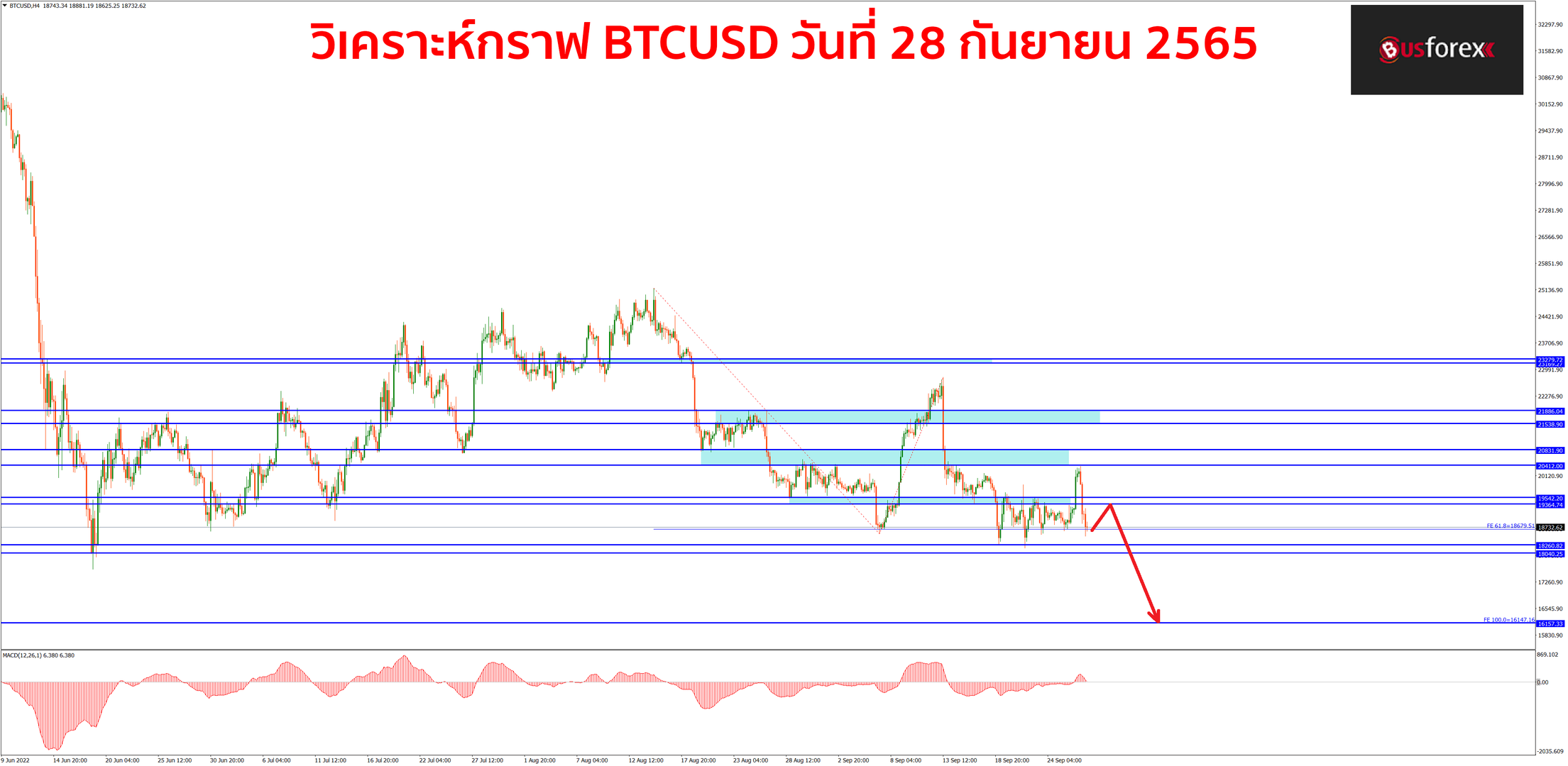 หลังจากที่เมื่อวานนี้กราฟดีดตัวขึ้นไปด้านบนอีกรอบ แต่เนื่องจากกราฟยังไม่สามารถทำแพทเทิร์นกลับตัวขึ้นให้เห็น ทำให้มองว่ากราฟจะเทกลับลงมาได้ต่อ และตอนนี้กราฟก็เทกลับลงมาตามที่คาดแล้วนะครับ แต่ก็ยังลงมาทำ new low ไม่ได้ในตอนนี้ หากดูจากแรงขายที่ดันลงมาประกอบกับแนวโน้มหลักของกราฟที่ยังเป็นขาลงอยู่ คาดว่ากราฟจะลงมาทำ new low ได้ต่อและมาทดสอบแนว Fibo 100% แถวๆราคา 16,160$ ได้ในท้ายที่สุด แผนเทรดวันนี้ก็จะมาเน้นหาจังหวะเข้า sell กันต่อไปก่อนนะครับ โดยจะใช้กรอบราคาเก่าที่ 19,360$-19,540$ เป็นจุดรอเข้า sell หากกราฟย่อกลับขึ้นไปทดสอบแล้วปิดแท่งเทียนกลับตัวลงได้อีกรอบครับ