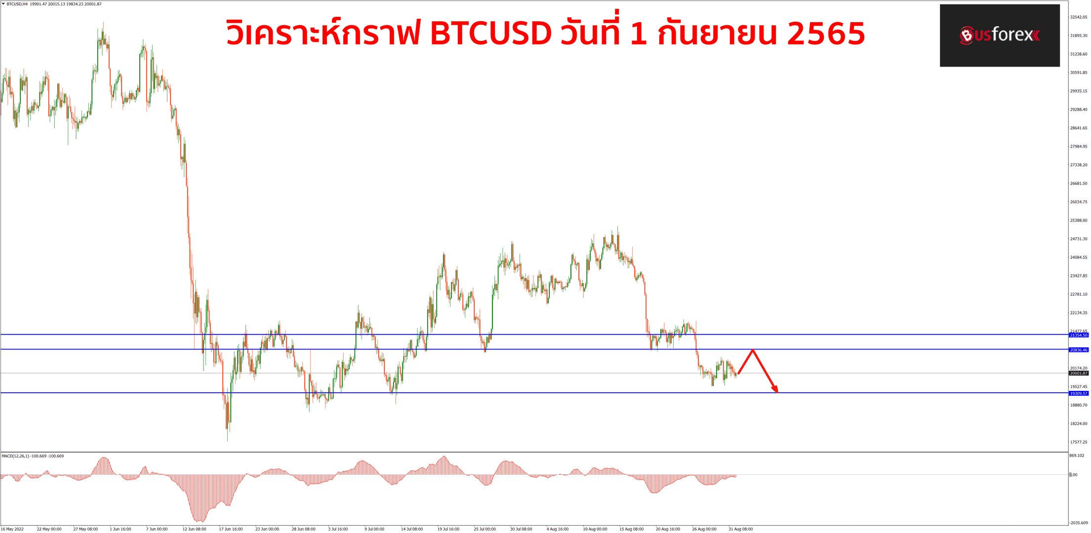 แนวโน้มหลักของกราฟ BTC ยังคงเป็นขาลง ตอนนี้กราฟก็กำลังพักตัวออกข้างอยู่แถวๆบริเวณราคา 20,000$ นะครับ และยังไม่ได้มีสัญญาณกลับตัวขึ้นใดๆ โอกาสที่กราฟจะลงมาทำ new low มาทดสอบแนวรับ 19,310$ ได้ต่อก็ถือว่ามีค่อนข้างสูง ดังนั้นหากกราฟยังไม่สามารถที่จะทำแพทเทิร์นกลับตัวขึ้นให้เห็น เราก็จะมาเน้นเปิด sell กันต่อไปก่อน ส่วนแนวต้านตอนนี้ก็ยังคงมีแนวต้านอยู่ที่ 20,840$ และ 21,350$-21,400$ ตามลำดับ หากกราฟกลับขึ้นไปทดสอบแนวต้านแล้วสามารถปิดแท่งเทียนกลับตัวลงได้ค่อยเปิด sell ลงมากันอีกทีครับ