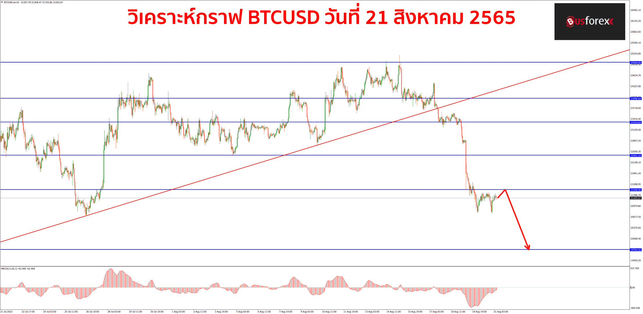 กราฟ BTC ตอนนี้กลับมาเป็นขาลงอย่างเต็มตัว ถึงแม้ว่าล่าสุดกราฟจะดีดตัวขึ้นได้อีกรอบ แต่เนื่องจากยังไม่ได้มีแพทเทิร์นกลับตัวขึ้นให้เห็น จึงทำให้มองว่ากราฟยังมีโอกาสที่จะกลับลงมาทำ new low ต่ออีกรอบได้ต่อ โดยจะมีแนวรับรออยู่ที่ราคา 19760$ – 20000$ โดยประมาณ ส่วนแนวต้านตอนนี้ก็จะมีแนวต้านอยู่ที่ 21440 และ 22400$ ตามลำดับ แผนเทรดในช่วงนี้ก็จะมาเน้นเทรดในฝั่ง sell เป็นหลักฝั่งเดียวกันไปก่อนนะครับ