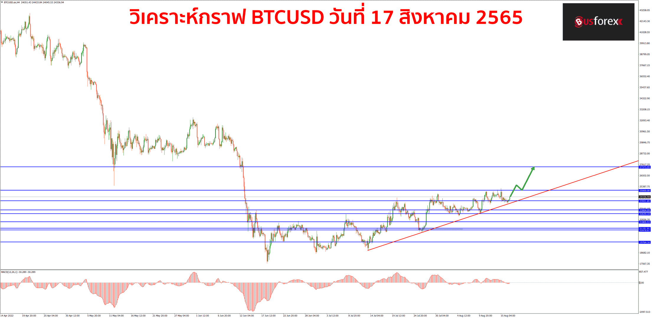 วิเคราะห์กราฟ BTCUSD วันที่ 17 สิงหาคม 2565 กราฟ BTC ย่อตัวกลับลงมาทดสอบแถวๆแนวรับที่บริเวณเส้นเทรนด์ไลน์ กราฟก็ได้ดีดตัวขึ้นอีกรอบ แต่ก็ยังขึ้นไปทำ new high ไม่ได้นะครับ ถึงแม้ว่าแนวโน้มกราฟตอนนี้จะมองเป็นขาขึ้นอยู่แต่เนื่องจากกราฟขึ้นไปทดสอบแนวต้านที่ราคา 25000$ อยู่ 2 รอบแล้วผ่านขึ้นไปไม่ได้ จึงทำให้มองว่าแนวต้านที่ราคา 25000$ เป็นแนวต้านที่มีนัยสำคัญสูง หากจะเปิด buy จึงควรรอให้กราฟเบรกขึ้นไปยืนเหนือแนวต้านนี้ให้ได้ก่อนแล้วค่อยหาจังหวะเปิด buy ขึ้นไปหา 27370$ กันอีกทีครับ