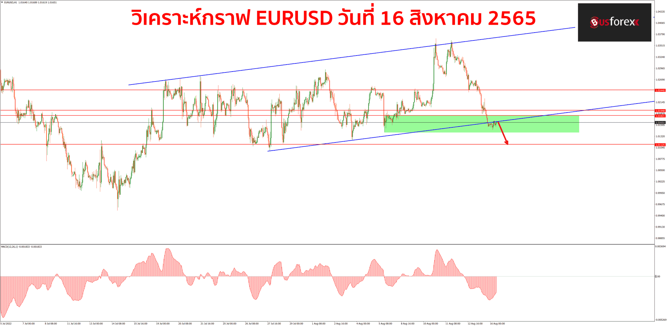 จากที่เมื่อวานกราฟได้ลงมาทดสอบแนวรับที่แถวๆราคา 1.0182 กราฟก็ได้แค่ดีดตัวเล็กน้อยเท่านั้นนะครับ กราฟไม่สามารถกลับขึ้นไปเบรกและยืนเหนือราคา 1.0244 ได้ สุดท้ายตอนนี้กราฟก็ปรับตัวลงมาจนหลุดกรอบ channel ได้แทน ทำให้ตอนนี้โอกาสที่กราฟจะกลับมาเป็นขาลงก็มีมากขึ้น และตอนนี้จะเห็นได้ว่ากราฟนั้นพยายามจะกลับขึ้นไปยืนในกรอบ channel ขาขึ้นอยู่หลายรอบแต่ก็ยังผ่านกลับขึ้นไปไม่ได้นะครับ ทำให้มองว่าโอกาสที่กราฟจะปรับตัวลงมาทดสอบแนวรับ 1.0113 ก็มีค่อนข้างมาก ดังนั้นแผนเทรดวันนี้ก็จะมาใช้แผนฝั่ง sell นะครับ โดยแนวต้านที่จะใช้เป็นจุดเปิด sell จะอยู่ที่ราคา 1.0182 และ 1.0195 ตามลำดับครับ