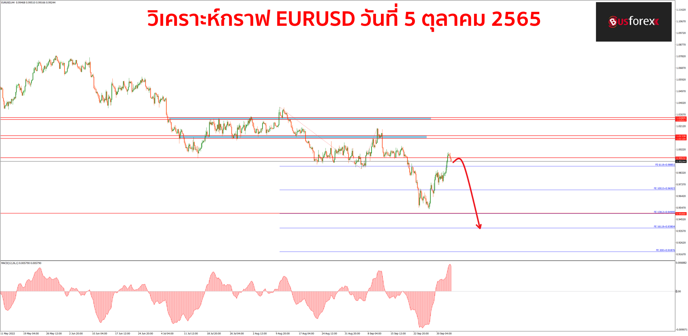 จากที่กราฟได้ขึ้นไปถึงแนวต้านที่ราคา 0.9953 กราฟก็สามารถทะลุผ่านขึ้นไปได้อย่างง่ายดายนะครับ แต่สุดท้ายตอนนี้กราฟก็ปรับตัวกลับลงมาอยู่ต่ำกว่าราคานี้ได้อีกรอบแล้ว ก็ต้องมารอดูกันต่อว่าหากกราฟกลับขึ้นไปเทสแนวต้านนี้อีกครั้ง กราฟจะสามารถทำแพทเทิร์นกลับตัวลงได้หรือไม่ หากกราฟทำแพทเทิร์นกลับตัวลงได้ก็ค่อยเปิด sell ลงมากันอีกทีนะครับ ส่วนเป้า TP หากไม่อยากถือลุ้น new low ก็ใช้แนว Fibo 100% ที่แถวๆราคา 0.9692 เป็นจุดปิดทำกำไรไปก่อน หรือไม่ก็ถือลุ้นเป้าที่ new low ที่ Fibo 138.2% ที่แถวๆราคา 0.9500 และ Fibo 161.8% ที่ราคา 0.9380 ไปเลยครับ