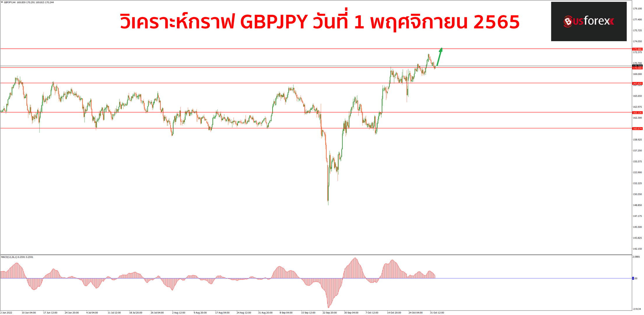 กราฟยังคงปรับตัวขึ้นไปทำ new high ตามแนวโน้มได้อย่างต่อเนื่องและยังไม่มีทีท่าว่าจะกลับตัวลงแต่อย่างใดเลยนะครับ ตอนนี้กราฟก็ได้ย่อกลับลงมาทดสอบอยู่ที่บริเวณแนวรับแถวๆราคา 170.0 อยู่พอดี และเริ่มจะมีแรงซื้อดันกราฟขึ้นได้บ้างเล็กน้อยแล้วนะครับ หากกราฟสามารถปิดแท่งเทียนกลับตัวขึ้นได้อีกรอบ ก็น่าจะได้เห็นกราฟขึ้นไปทำ new high ไปทดสอบแนวต้านที่ราคา 172.88 ได้ต่อ แต่หากกราฟหลุดลงมายืนต่ำกว่า 170.0 ได้แทน ก็มีโอกาสได้เห็นกราฟลงมาทดสอบแนวรับ 167.62 ได้เช่นกันครับ