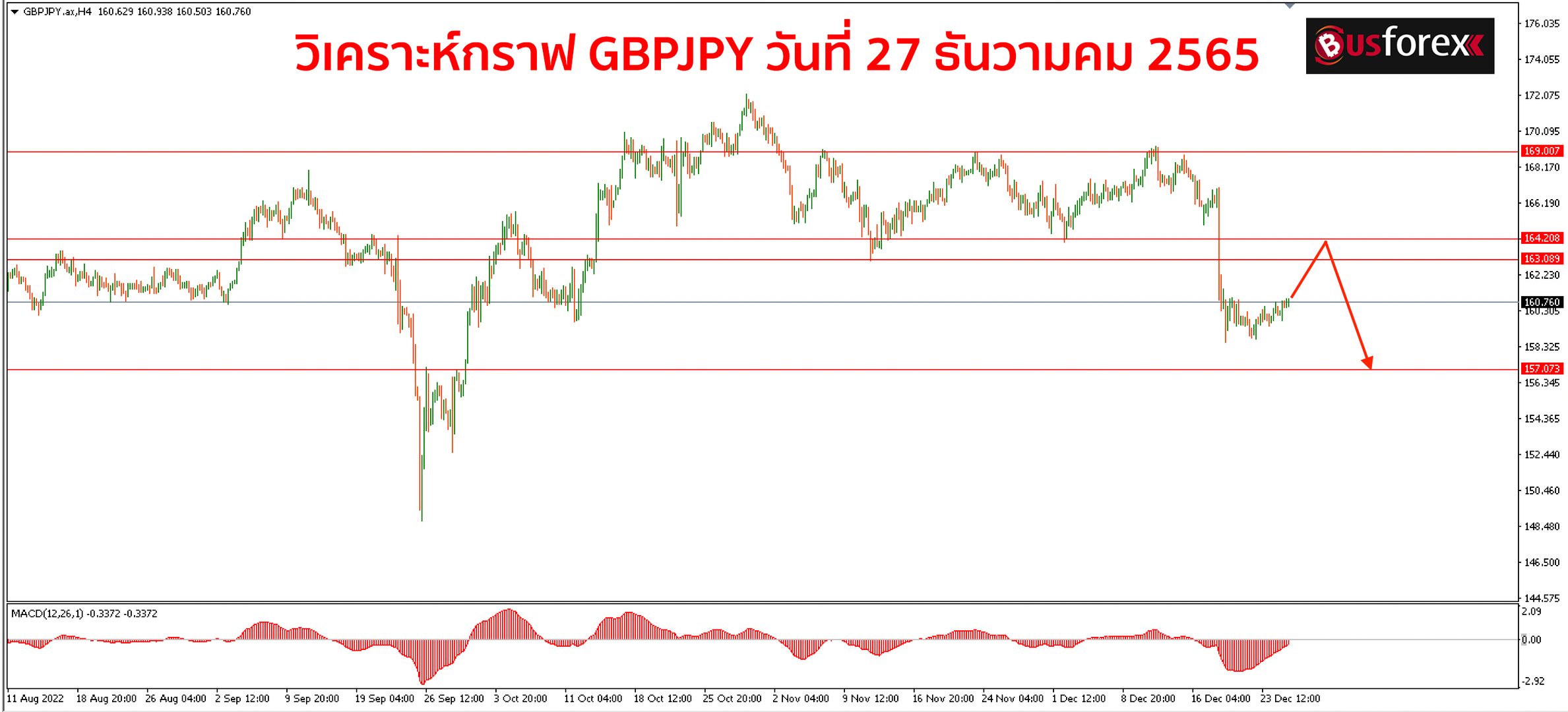หลังจากที่กราฟได้เทลงมาอย่างรุนแรงในรอบล่าสุดกราฟก็วิ่งพักตัวเป็น sideway ออกข้างมาจนถึงตอนนี้นะครับ ถึงแม้ว่ากราฟจะดีดตัวขึ้นได้บ้างแต่ก็ยังคงไม่ได้มีสัญญาณกลับตัวขึ้นใดๆให้เห็น การเทรดในระหว่างนี้จึงมองว่าฝั่ง sell น่าจะมีโอกาสที่จะได้ปิดกำไรได้ง่ายกว่า โดยแนวต้านในตอนนี้มองใว้ที่ราคา 163.0 – 164.2 โดยประมาณ หากกราฟขึ้นไปทดสอบแนวต้านที่โซนนี้แล้วสามารถปิดแท่งเทียนกลับตัวลงหรือทำแพทเทิร์นกลับตัวได้อีกรอบค่อยเปิด sell ลงมาหาแนวรับที่ราคา 157.07 กันครับ