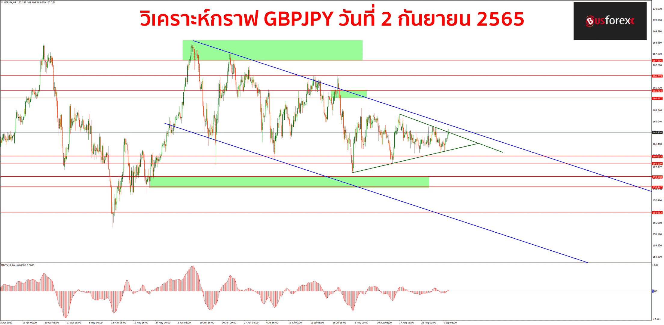 กราฟยังคง sideway ออกข้างอยู่เหมือนเดิมนะครับ ตอนนี้กราฟก็ได้เกิดแพทเทิร์นสามเหลี่ยมขึ้นมาแล้ว หากกราฟหลุดแพทเทิร์นสามเหลี่ยมออกมาได้ก็พอจะมีลุ้นที่จะได้เห็นกราฟเลือกทิศทางที่ชัดเจนกันสักที แต่ตอนนี้ที่กราฟยังไม่ได้มีทิศทางที่ชัดเจนส่วนตัวมองว่ายังไม่เหมาะที่จะเทรดถือยาวนะครับ เหมาะกับการเทรดเก็บรอบสั้นจากแนวรับแนวต้านจบไวมากกว่า แนวรับแนวต้านตอนนี้ก็ยังคงมีแนวรับอยู่ที่ราคา 160.6 – 160.1 ที่เดิม ส่วนแนวต้านจะอยู่ที่ราคา 164.7-165.22 ครับ