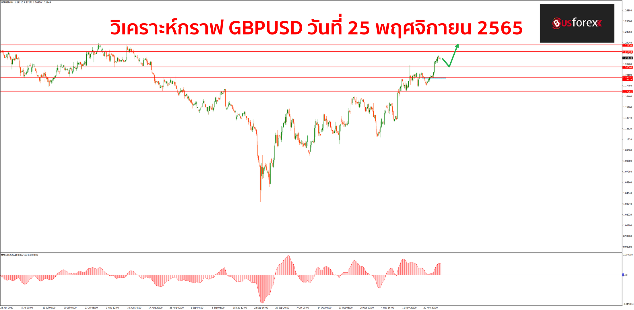 แนวโน้มกราฟที่ TF H4 ยังคงเป็นขาขึ้นนะครับ แนวต้านถัดไปที่กราฟจะขึ้นไปทดสอบได้ต่อจะอยู่ที่ราคา 1.2192 ซึ่งแนวต้านนี้เป็นแนวต้านซัพพลายโซนที่เคยดันกราฟลงไปรอบใหญ่ในอดีต หากกราฟขึ้นไปชนแนวต้านนี้อาจจะมีแรงขายทุบกราฟกลับลงมาอีกรอบได้ ดังนั้นหากถือ buy อยู่ แนะนำให้ใช้กรอบแนวต้านนี้เป็นจุดปิดทำกำไรไปก่อนนะครับ ส่วนแนวรับวันนี้ยังคงมีแนวรับอยู่ที่เดิมที่ราคา 1.2000 ที่สามารถใช้เป็นจุดเปิด buy ได้หากกราฟลงมาทดสอบแล้วมีสัญญาณกลับตัวขึ้นอีกรอบครับ