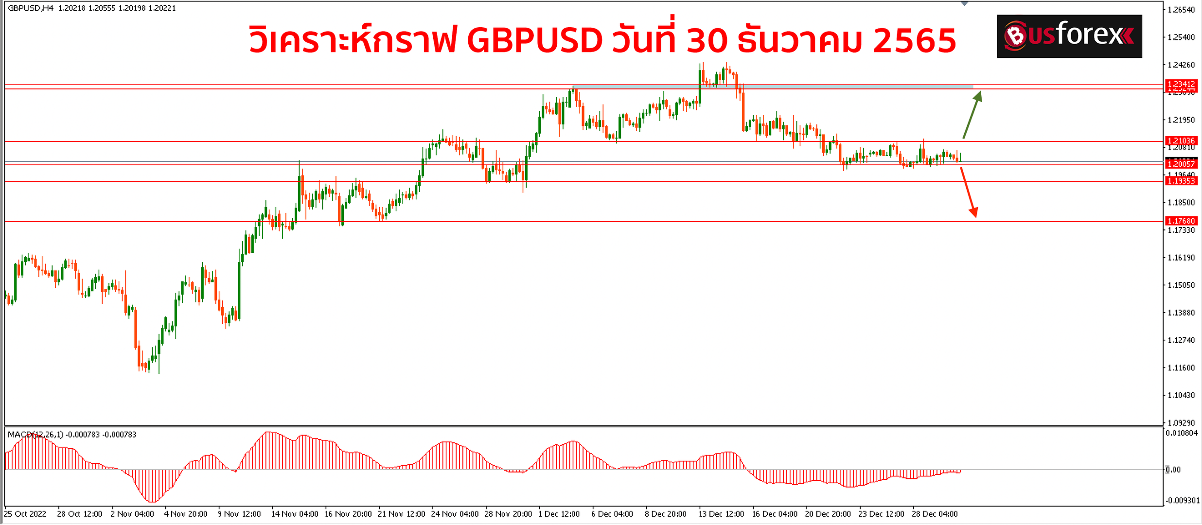 แนวโน้มหลักของกราฟตอนนี้ยังคงเป็นขาขึ้น แต่ช่วงหลายวันที่ผ่านมากราฟนั้นวิ่งเป็น sideway ออกข้างอยู่ในกรอบแคบๆระหว่างแนวรับ 1.2000 กับแนวต้านราคา 1.2100 อยู่นะครับ หากกราฟเบรกขึ้นไปยืนเหนือแนวต้าน 1.2100 ได้เมื่อไหร่ เป้าหมายถัดไปที่กราฟจะขึ้นไปทดสอบได้ต่อจะอยู่ที่ราคา 1.2324 – 1.2341 โดยประมาณ แต่หากกราฟเบรกแนวรับ 1.2000 ลงมาได้แทน ก็จะมีแนวรับถัดลงมาอยู่ที่ราคา 1.1935 และ 1.1768 ตามลำดับครับ