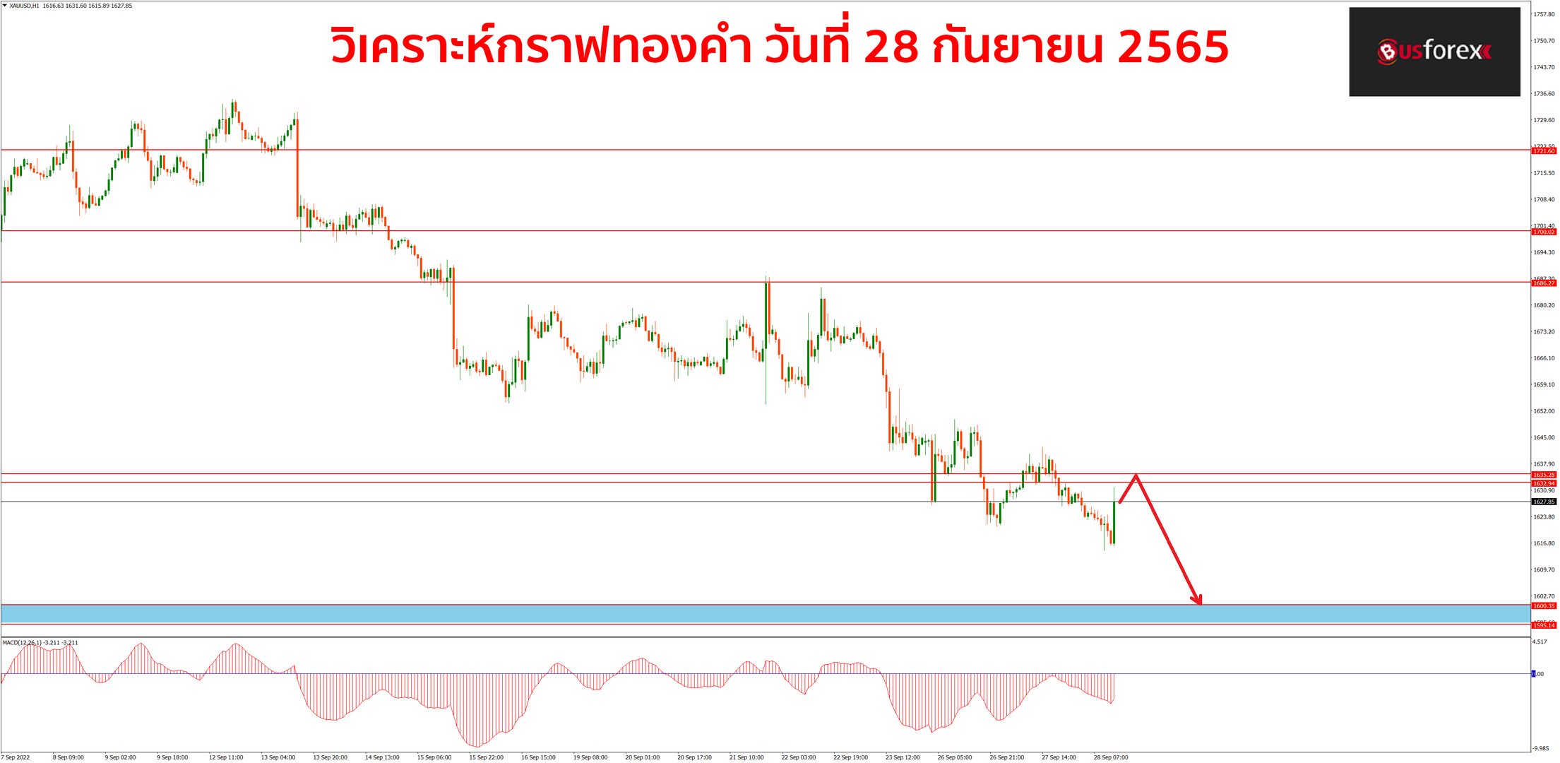 กราฟทองคำยังคงปรับตัวลงมาทำ new low ได้อย่างต่อเนื่อง แต่ล่าสุดเมื่อสักครู่ที่ผ่านมาหลังจากที่กราฟลงมาแทงราคาทำ new low ได้ กราฟทองคำดีดตัวขึ้นอย่างรวดเร็วและรุนแรงกันเลยนะครับ แต่เนื่องจากแนวโน้มหลักของกราฟยังคงเป็นขาลง และการดีดตัวขึ้นของกราฟในตอนนี้ก็ยังไม่ใช่สัญญาณการกลับตัวขึ้นแต่อย่างใด จึงมีโอกาสที่กราฟจะปรับตัวกลับลงมาได้อีกรอบอยู่ ดังนั้นแผนเทรดในระหว่างนี้ก็จะยังคงเน้นแผน sell เป็นหลักต่อไปก่อน โดยแนวรับที่จะใช้เป็นเป้า TP ยังคงใว้ที่เดิมที่ราคา 1600 ส่วนแนวต้านตอนนี้จะมีแนวต้านอยู่ที่กรอบราคา 1633-1635.3 โดยประมาณครับ