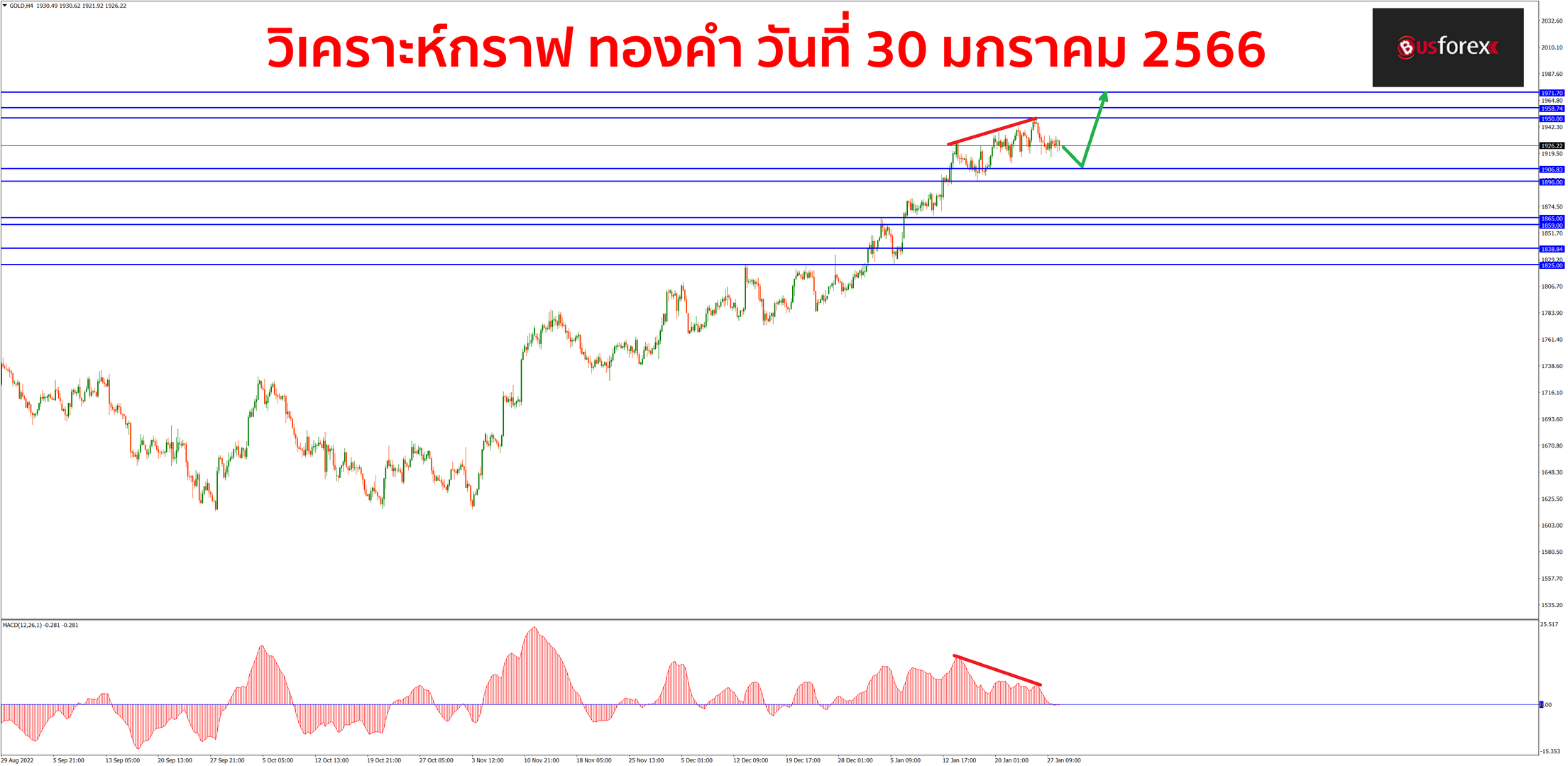 กราฟทองคำที่ TF H4 ตอนนี้ยังคงอยู่ในแนวโน้มขาขึ้นอยู่นะครับ ถึงแม้ว่าตอนนี้กราฟจะปรับตัวกลับลงมาได้บ้างแต่ก็ไม่ได้มีสัญญาณกลับตัวลงแต่อย่างใด ดังนั้นฝั่งแรงซื้อในตอนนี้จึงยังมีความได้เปรียบมากกว่าเหมือนเดิม หากกราฟเบรกขึ้นไปทำ new high และยืนเหนือ 1950 ได้จะมีแนวต้านถัดไปอยู่ที่ราคา 1960 และ 1970 ตามลำดับ สำหรับแผนเทรดในช่วงนี้ถึงแม้ว่ากราฟจะเป็นขาขึ้นแต่เนื่องจากสัญญาณจาก MACD มีสัญญาณ divergence แล้วนะครับ อาจจะต้องระวังกราฟจะพักตัวลงมารอบใหญ่ได้ ดังนั้นหากจะเปิด buy แนะนำให้รอกราฟย่อลงมาทดสอบแนวรับแล้วสามารถปิดแท่งกลับตัวขึ้นให้เห็นชัดๆก่อนแล้วค่อยเปิด buy จะดีกว่าครับ สำหรับแนวรับตอนนี้จะมีแนวรับอยู่ที่ราคา 1907 ครับ