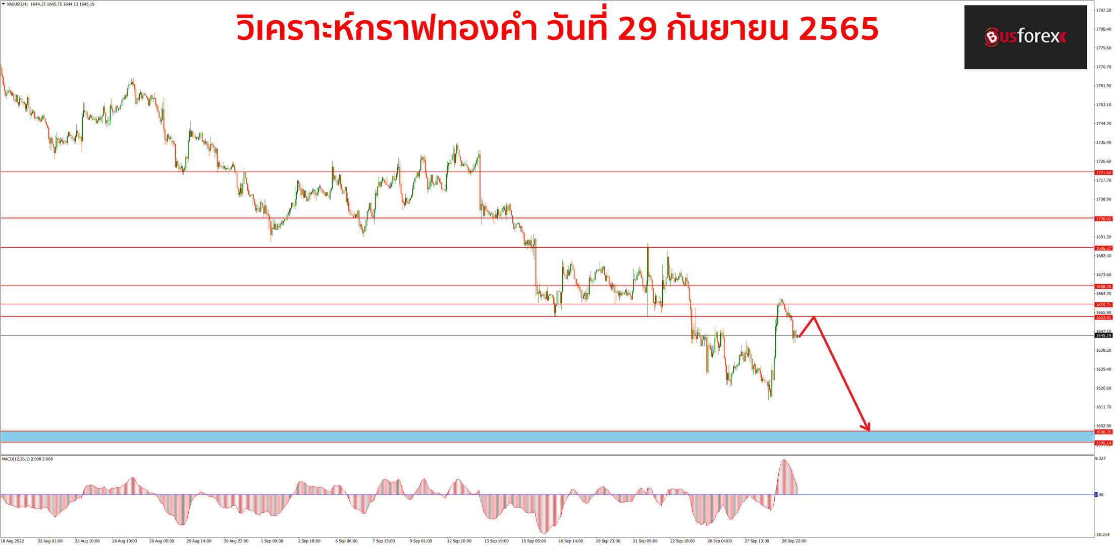 หลังจากที่กราฟทองคำได้ดีดตัวขึ้นอย่างรุนแรงอีกรอบจนผ่านแนวต้านที่กรอบราคา 1633-1635.3 ขึ้นไปได้อย่างง่ายดาย ก็ทำให้แผน sell ของเมื่อวานต้องยอมตัดขาดทุนทิ้งไปนะครับ ตอนนี้กราฟก็ย่อตัวกลับลงมาได้เล็กน้อย ถึงแม้ว่าแนวโน้มหลักของกราฟจะยังเป็นขาลงแต่จากแรงซื้อที่ดันราคาขึ้นในรอบนี้ถือได้ว่ามีค่อนข้างมาก จึงยังต้องระวังกราฟจะปรับตัวขึ้นไปทดสอบแนวต้านด้านบนได้ต่อ ดังนั้นหากจะเปิด sell ก็แนะนำให้รอสัญญาณกลับตัวลงจากบริเวณแนวต้านต่างๆกันก่อนนะครับ แล้วค่อยเปิด sell ลงมากันอีกที สำหรับแนวต้านตอนนี้จะมีแนวต้านอยู่ที่ราคา 1653.9 , 1659.7 และ 1668.3 ตามลำดับ ส่วนแนวรับจะอยู่ที่ราคา 1630 , 1620.5 และ 1600 ตามลำดับครับ
